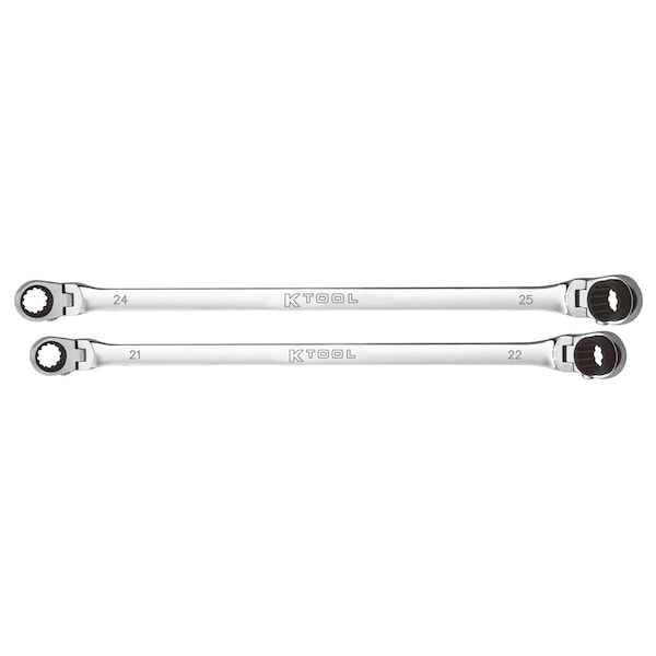 This K-Tool XD product comes with a patented 90 tooth design which is excellent for tight working space (Included Sizes: 21X22MM AND 24X25MM);Extra long, flexible and reversible making it the most versatile set of ratcheting wrenches on the market;The 180� rotating head on both ends of the wrench allows the ratchet wrench flexibility to bypass obstacles for easy use at any angle;Innovative internal gear mechanism and spherical profile (Spline Plus) makes this one of the best performing ratcheting wrenches available;Raised box end gear provides more surface contact and access to recessed fasteners;Included Sizes: 21X22MM AND 24X25MM