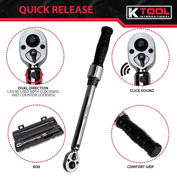 The K Tool International KTI72120A Adjustable Ratcheting Torque Wrench is the perfect tool for any automotive technician. It allows you to adjust and apply torque up to 250 ft-lbs, which makes it a very versatile wrench. The adjustable ratcheting torque wrench will help you make sure your car's engine stays in good shape with its accurate measurements of force on bolts and nuts.