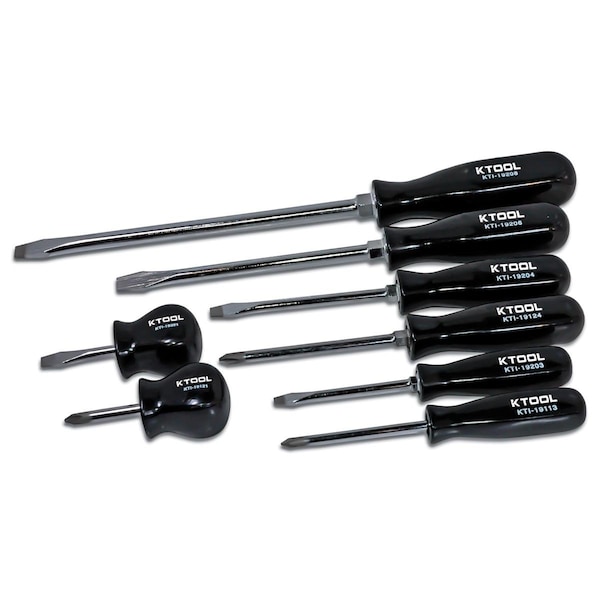 (1) #1 Phillips 3" Blade; (1) #2 Phillips 1-1/2" Stubby; (1) #2 Phillips 4" Blade; (1) Stubby Slotted; (1) 3" Slotted; (1) 4" Slotted; (1) 6" Slotted; (1) 8" Slotted