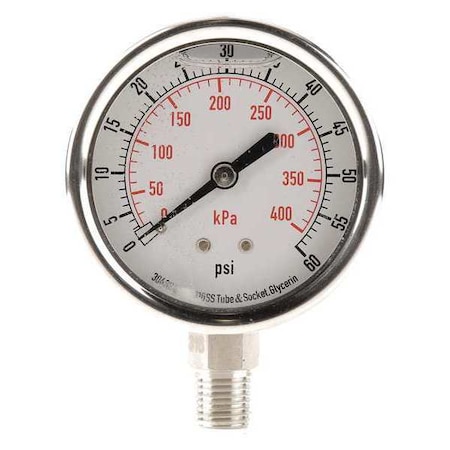 Pressure Gauge, 0 to 60 psi, 4 1/2 in Dial, 1/4 in NPT, Bottom Location, Steel Case Material