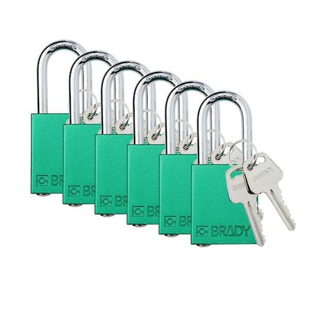 Padlock, Keyed Alike, Aluminum, Green, 1 1/2 in Shackle Height, 1 1/2 in Body Width, 12 No. of Keys