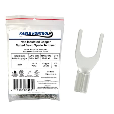 Non Insulated Copper Butted Seam Spade Terminal, 22-18 AWG, Stud Size # 10, 100 Pcs, 100PK
