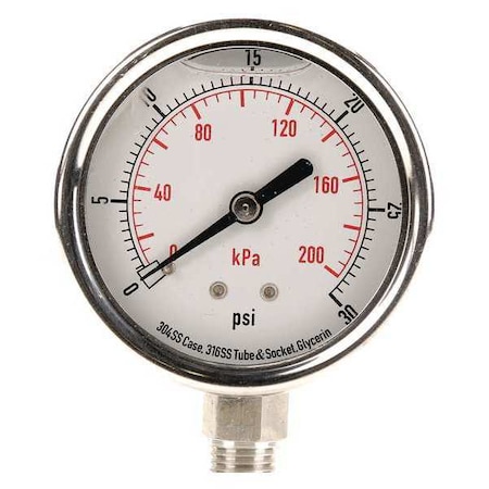 Pressure Gauge, 30 PSI , 2" Face, 2 In. Dial, 1/4 in MIP MIP, Lower Location, Steel Case Material