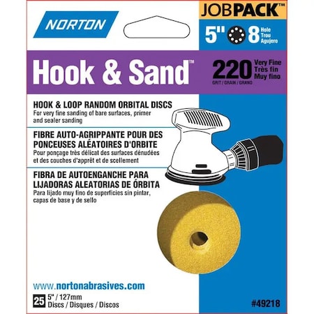 Hook-and-Loop Sanding Disc, 5" Dia, 8 Hole, Aluminum Oxide, P220 Grit, Coated Type, A296