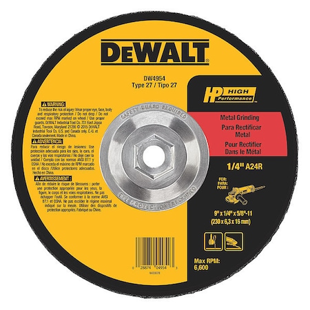 Depressed Center Grinding Wheel, Type 27, 9 in Dia, 0.25 in Thick, 5/8"-11 Arbor Hole Size, 24 Grit