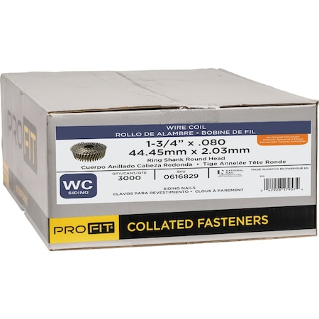 1-3/4''x0.080'' 15 Deg Wire Weld Hot Dipped Glvnzd Ring Shank Round Head Coil Siding Nail, 3000 Ct.