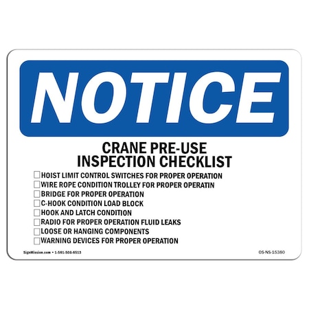 Safety Sign, OSHA Notice, 18" Height, NOTICE Crane Pre-Use Inspection Checklist Sign, Landscape