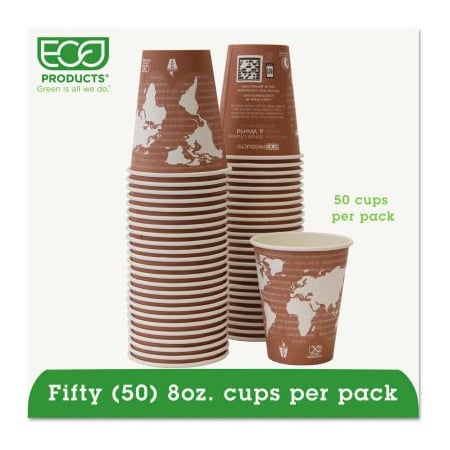 Eco-Products Hot Paper Cups, World Art, 8 Oz., Plant-Based Resin Inner Lining, 50/Pack, Maroon