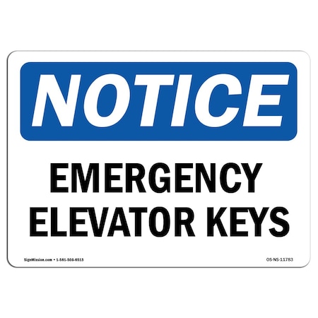 Safety Sign, OSHA Notice, 12" Height, Rigid Plastic, Emergency Elevator Keys Sign, Landscape