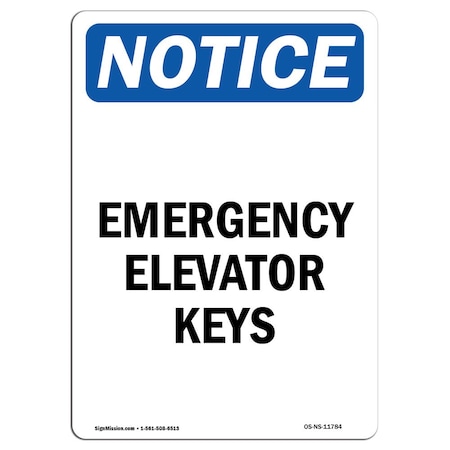 Safety Sign, OSHA Notice, 24" Height, Rigid Plastic, Emergency Elevator Keys Sign, Portrait