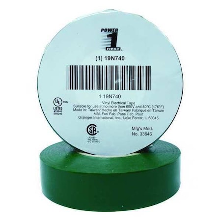 Electrical Tape, Vinyl, Green, 22 yd L, 3/4 in W