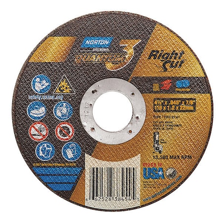 Abrasive Cut-Off Wheel, Type 1, 4 1/2 in Dia, 0.045 in Thick, 7/8 in Arbor Hole Size, Ceramic