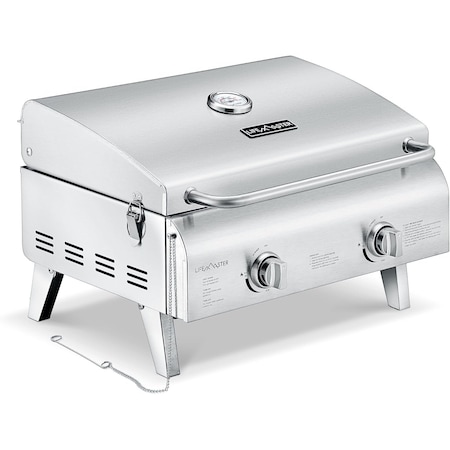Portable Tabletop Gas Grill, Stainless Steel, 2 Burners, 20,000 BTU, Folding Legs, Windproof Lid