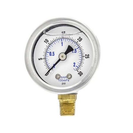 2 1/2 in Dial, 30 in Hg Vac/0/30 PSI & Bar, 1/4 in NPT, Lower Mount Glycerin Filled Pressure Gauge