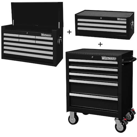 WESTWARD Rolling Cabinet Kit, Intermediate & Top Chest, 19-Drawers Total, Powder Coated Black