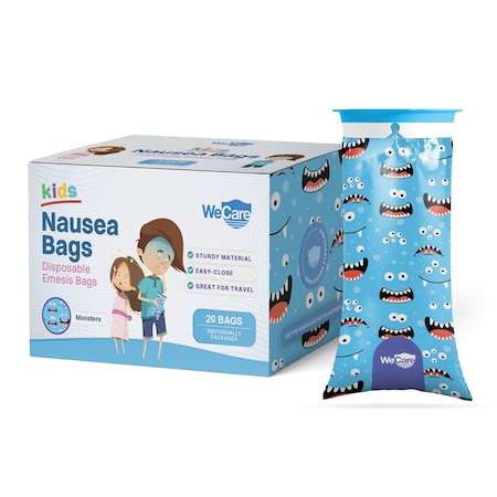 Kids Emesis Bags For Nausea and Motion Sickness, Individually Wrapped, 20 Pack, Monster Print, 20PK
