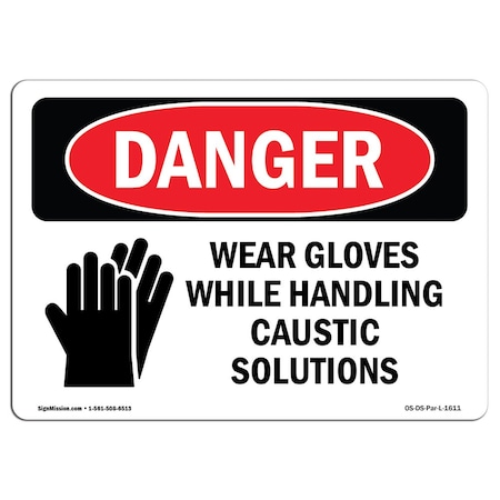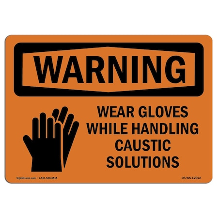 OSHA Sign, Wear Gloves While Handling Caustic Solutions, 24in X 18in Plastic, 24" W, 18" H, Lndscp