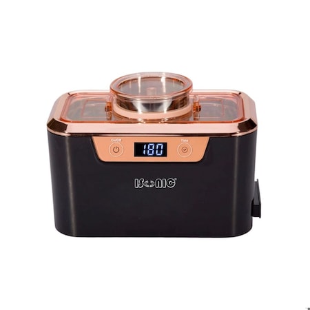 Miniaturized Commercial Ultrasonic Cleaner, black and rose gold colors, with integrated ss. beaker