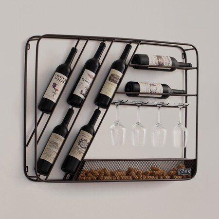 Vintage-Inspired Decorative Metal Wall-Mounted Wine Rack with Cork and Wine Glass Holder,