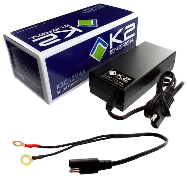 K2 Energy K2C12V4A 12V 4Ah LiFePO4 Smart Charger with Ring TerminalsK2 Energy K2C12V4A 12V 4Ah LiFePO4 Smart Charger is K2's smart Lithium Iron Phosphate battery charger. It provides short circuit protection as well as over current protection. It has a charging LED indicator light so you know when your battery is fully charged. The charger is also light weight making it portable and easy to carry.K2 Energy K2C12V4A Charger Specifications:AC Input Voltage: 50 / 60Hz 100-240 VACAC Input Current: 1.8 AOutput Voltage: DC 14.6 VOutput Load: 4.0 A MaxK2 Energy K2C12V4A Charger Key Features and Benefits:Short Circuit ProtectionOver Current ProtectionCharging LED indicator lightCompact and Lightweight PortabilityReverse Polarity & Auto RecoveryMultiple K2 Battery CompatibilityQuick Charge timesCustom Terminals AvailableK2 Energy K2C12V4A Charger Operating Conditions:Operating Temperature: 0? - 40? CStorage Temperature: -20? - 60? COperating Humidity: 5% - 65% RHStorage Humidity: 5% - 65% RHCaution: Indoor use only - K2|LiFeP04 batteries onlyDimensions: 5.5 in. x 2.4 in. x 1.8 in. - (140mm*62mm*35mm)Terminals: RING TERMINALSSafety Rating: CE, UL, FCC, RoHS, PSEK2 Energy Warning:Use special caution when working with secondary lithium cells, they are very sensitive to charging characteristics and may explode if mishandled.Protective Circuit Board is required when making packsMake sure user has enough knowledge on secondary lithium rechargeable batteries in charging, discharging and assembly before use.Put the batteries in fire-proof container in chargingNever leave batteries unattended when chargingDo not put batteries on wood surface or carpet when chargingNeed more than one K2 Energy K2C12V4A Lithium Iron Phosphate Charger? We offer great discounts on quantity orders and Discount Shipping offers available.SpecificationsBrand: K2 EnergyOutput Voltage: 12VAmperage: 4AhChemistry: LiFePO4Length: 5.5"Height: 2.4"Width: 1.8"Terminal Type: Ring TerminalsCompatibilityK2 Energy: K2B12V10EB, K2B12V19EB, K2B12V3EB, K2B12V7EB, K2B24V10EB, K2B24V25EB, K2B24V48EB, K2B24V50EB, K2D6V12EB