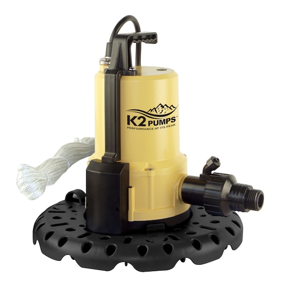 The K2 Pumps 1/4 HP Automatic Pool Cover Pump is lightweight and easy to use for removing water from pool covers and spas. Constructed of corrosion-resistant reinforced thermoplastic, the pump will remove up to 30 gallons per minute (GPM) at 0' of lift. The pump is designed with a sensor that detects water and automatically turns the pump ON and OFF. The energy-efficient, PSC oil-free motor has auto reset thermal overload protection. The Strainer Base helps protect the pool cover, filters debris and keeps the pump stable. The Base "snaps" on and off, allowing it to be used as a submersible utility pump. Includes a 25' pull rope to position the pump on the pool cover and for easy retrieval. 1" MNPT Discharge and garden hose adapter. Comes with a 25 foot power cord with GFCI switch.