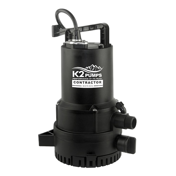 The K2 Pumps CONTRACTOR SERIES 1/4 HP Harsh Duty 2-in-1 Utility pump is an innovative new pump. The unique design allows the pump to be used as both a submersible utility pump and non-submersible transfer pump. The oil-cooled motor and PPS thermoplastic impeller provide high temperature performance and mechanical strength. This enables the pump to handle a wide variety of harsh liquids such as saltwater, seawater, soapy water, polypropylene glycol antifreeze, soluble oil machine tool coolants, and hot water up to 130Deg. Applications as a Submersible utility include: dewatering in coastal areas or salt-water marine areas, descaling, drain utility sinks, flooded basements, flat roofs, and pool covers. As a non-submersible Transfer pump it can be used to drain water heaters, boats, clogged sinks, water softeners, washing machines, utility sinks, and fill/pressurize radiant heating systems. Flow rate up to 1600 GPH as a submersible utility, and 950 GPH as a non-submersible transfer pump. Comes with a suction hose, suction strainer, 3/4 inch garden hose threaded connection and 10 foot power cord.