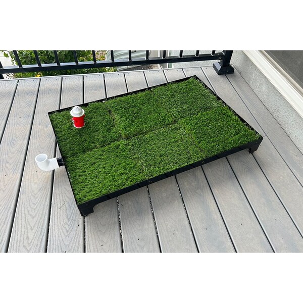 - • Easy Cleanup: Cleaning up after your pet has never been easier. The synthetic grass pad is equipped with a drainage system that quickly whisks away liquid waste, leaving a fresh and dry surface. Simply rinse with water and mild soap, and your Dog Potty Station is good to go