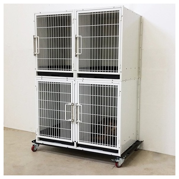 The professional enclosed cage bank kennels you want at the price you want to pay. K9 Kennel Store Modular Kennel Custom Cage Bank Kits are made of solid, zinc plated 20 gauge steel and are powder coated in off beautiful white. Cages banks are available in four configurations. Each configuration includes a different combination of small, medium and large size cages see the specifications tab for complete details Small and medium cages each include a floor tray and a floor grate. Large cages have two trays and two floor grates so you can use and clean each side individually. Large cages can be divided into two smaller cages using the included divider.