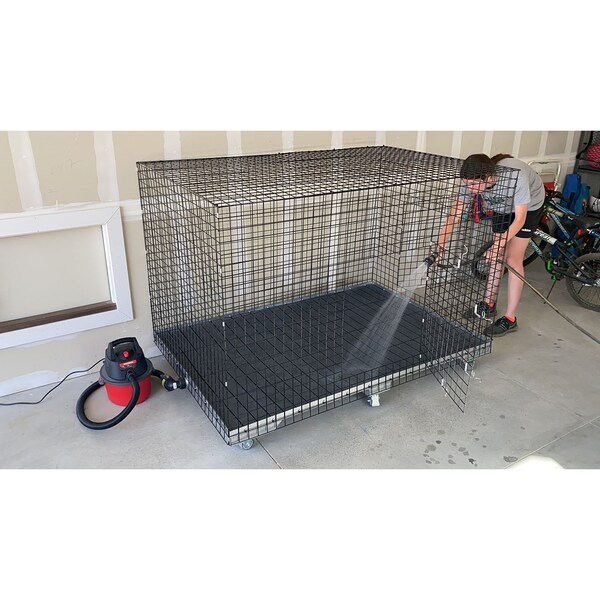 K9 Kennels, Quick N Clean Dog Crates are unique and easy to clean, simply turn on the vacuum and spray the tray out with a hose or cordless power washer. The water quickly funnels into the drain and is evacuated by the wet vacuum. Each dog crate comes with lockable casters so they can be easily be moved around the garage or house. These systems are designed for use in a garage, house or outdoors and come in four sizes 2x4ft, 4ftx4ft, 4ftx6, and 4ftx8ft which are often used for big dogs or multiple dogs. The Quick and Clean system is also available in traditional kennels, garage kennels, walk in pods, cage banks and potty stations. Floor trays and wire panels are galvanized to help prevent rust. Assembly is required. Dog Crate, easy to clean, garage kennel, pet enclosure, dog pen., Optional Raised Tile flooring, Tile Turf, Dog Cots, wet vacuum and Cordless power washer can be added at the time of check out.