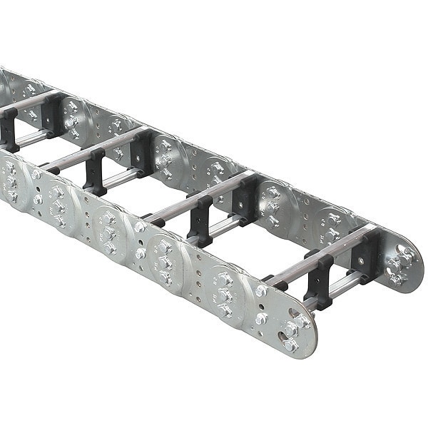Cable and Hose Carrier, Crossbar Style Threaded Joint, Carrier Design Open, Cavity Width 4 in, Cavity Height 1.22 in, Height 2.0 in, Outside Width 4.6 in, Bend Radius 2.95 in, Link to Link Pitch 2.5 in, Mounting Brackets Included No, Carrier Links Material Steel, Crossbar Material Aluminum, Length 60 in, Frame Stay Twist In Twist Out Alum Bar, Includes No Bracket Included, Loop Height 8.86 in, Loop Length 19.53 in, Number of Links 24, Style Open, Type Varitrak(R) Heavy Duty Steel