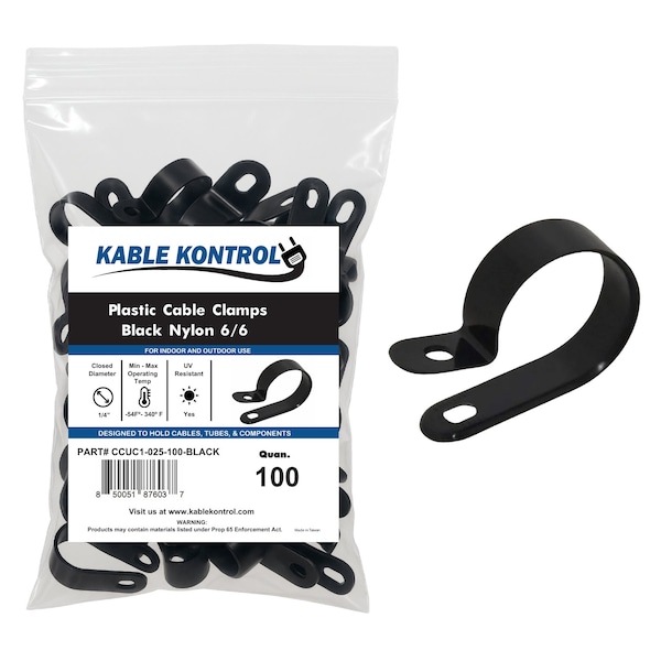 Kable Kontrol Nylon Cable Clamps are the ideal solution to gain control of your messy cables and wires. These plastic cable clamps are made with high quality, durable, and crack-resistant nylon 6-6 plastic and can easily mount bundles of cables to walls, ceilings, or any other surface. The design is extremely user-friendly letting you open and close the jaws with just one hand. These cable clips are safe for use in indoor and outdoor applications. Made with high quality, durable, and crack-resistant nylon plastic, you can use these plastic clamps for long runs of bundled cables and messy cables such as: fiber optics, entertainment systems, PC peripherals, medical devices, and appliances. To install the R-type cable clamps, simply position them at the desired location, insert the cable, bundle, or tubing, and then proceed to screw through the hole. You can control how tight or loose the plastic wire clamps fits with a single screw. Buying these cable clamps puts you in full control of your cable management with no waste as you can use what is needed and save the rest for later. Solve your cable management needs, keep your electronic equipment in order, and workplaces free of messes with these plastic wire clamps.
