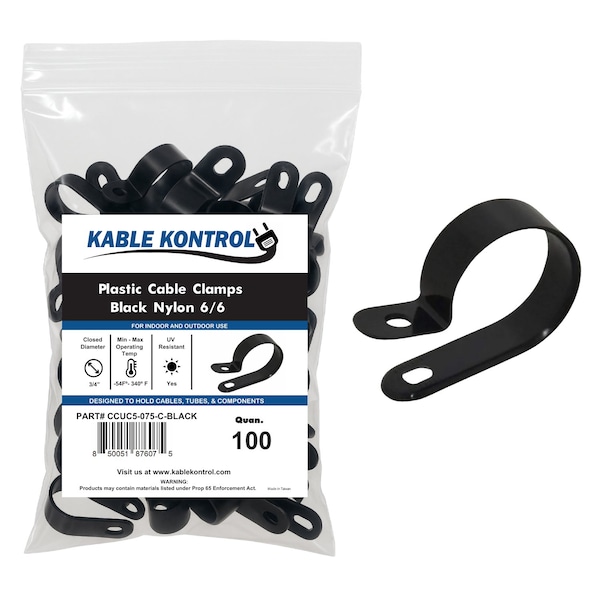 Cable Clamp, Nylon 6/6, 3/4 in Bundle Dia., Black, 1-3/8 in L, 100 PK