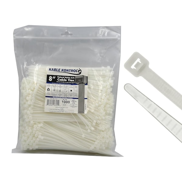Cable Tie, 8 in L, 2.16 in Max Bundle Dia., Natural, Nylon 6/6, 40 lb Strength, 1000 PK