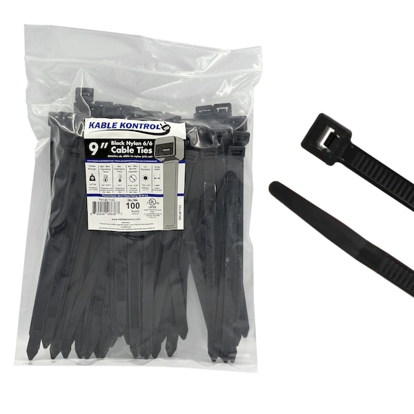 Cable Tie, 9 in L, 2.30 in Max Bundle Dia., Black, Nylon 6/6, 250 lb Strength, 100 PK