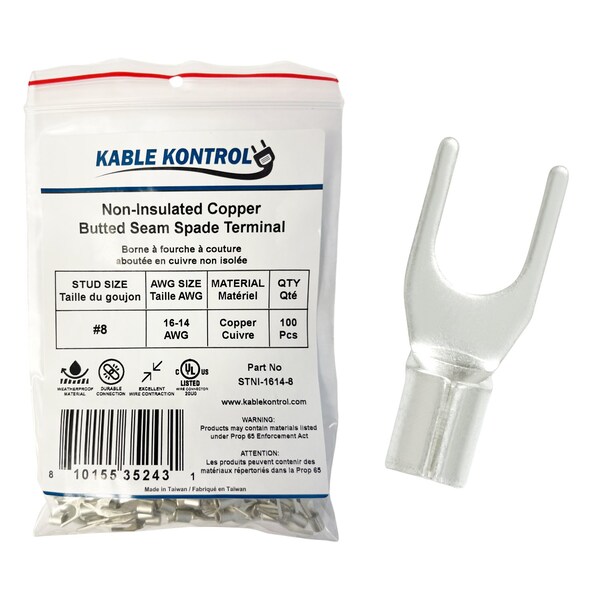 The Kable Kontrol Butted Seam Fork Terminals are high-quality, non-insulated electrical wire connectors designed for a wide range of applications. Made from pure copper with a tin-plated surface, these terminals offer excellent conductivity and corrosion resistance making them ideal for automotive, marine, HVAC, industrial, and aerospace wiring. These spade terminals can handle temperatures up to 105 DegC 221 DegF and support voltages up to 600 volts, ensuring reliable performance in tough environments. The brazed seam design prevents the wire from falling off, creating a strong, stable connection. The open-end design allows for easy installation and removal, making them a convenient choice for various electrical tasks. These terminals meet UL safety standards file no. E545229 for guaranteed quality and reliability. Perfect for both professional and DIY electrical work, they are built to last and provide secure, long-term connections.