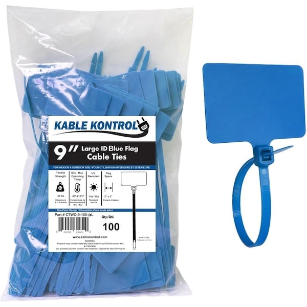- Dimensions: 9 Inch Long | 100-Pcs/Pack | Blue | 80 Lbs. Strength | UV Resistant | Nylon | 2" x 3" Flag Space | 6mm Strap Width | Temp Range: -45° – 100°C (-50° F – 212°F)
