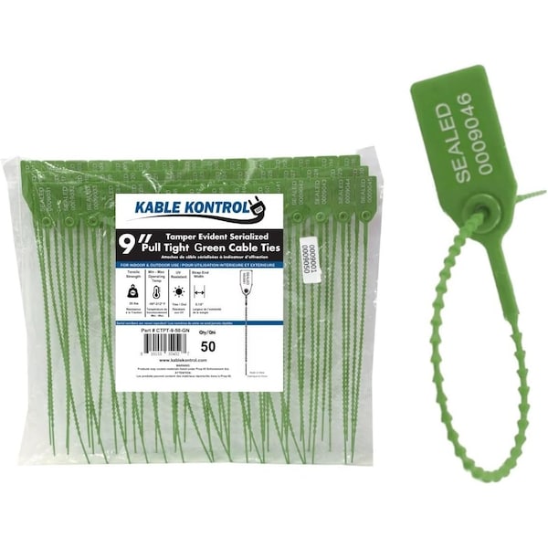 Kable Kontrol Pull Tight Identification & Serialized Zip Ties offer superior security and identification, ideal for both industrial and personal use. Each pack contains 50 high-density polyethylene HDPE zip ties, crafted for durability and resistance to UV and weather conditions. They feature permanently engraved, non-repeating serial numbers up to 7 digits, ensuring unique identification and enhanced traceability. With a tensile strength of 50 lbs, these zip ties provide reliable fastening and tamper-proof security. Their 0.20in diameter strap end allows for easy threading and tightening, while their resilience to temperatures up to 230 DegF makes them suitable for various environments. Conveniently packaged in strips of 10, these ties are perfect for fire extinguishers, applications in transportation, logistics, agriculture, and more, offering a robust and reliable solution for secure and identifiable fastening.