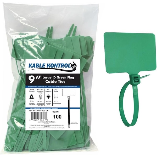 - Dimensions: 9 Inch Long | 100-Pcs/Pack | Green | 80 Lbs. Strength | UV Resistant | Nylon | 2" x 3" Flag Space | 6mm Strap Width | Temp Range: -45° – 100°C (-50° F – 212°F)