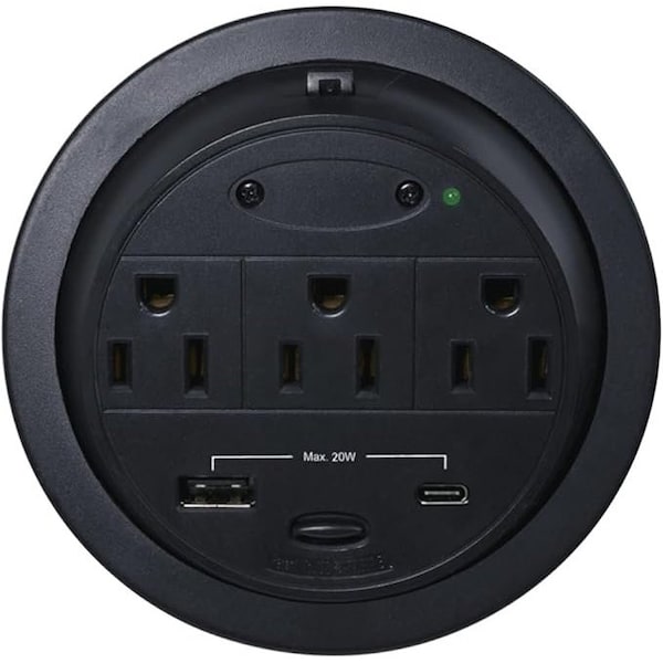 - DIMS: 3 x AC Power Outlets 125 V – 1 x USB-A & 1 x USB-C Charging Ports | 8 Ft Cord | Black | 1 Pc | 4.21" (107mm) Hole Cut Size | 4-3/8" Outer Grommet Ring