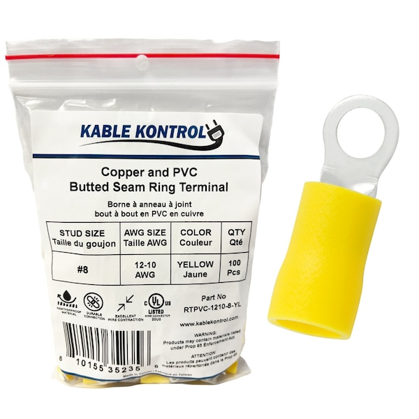 The Kable Kontrol Butted Seam PVC Ring Terminal is a high-performance, durable wire connector designed for a variety of demanding applications. Made from premium copper and PVC insulation, these terminals are ideal for automotive, marine, HVAC, and military use. The design ensure a secure and efficient connection in a wide range of wiring systems. Rated for up to 600 volts and capable of withstanding temperatures up to 105 DegC 221 DegF, they offer exceptional performance in both high-voltage and high-temperature environments. The funnel entry design simplifies wire insertion, eliminating strand hang-ups and improving crimping efficiency. Featuring a butted seam barrel, these terminals resist separation under pressure, ensuring long-lasting and reliable connections. The adhesive-lined tubing creates a watertight seal, providing protection against moisture, corrosion, and vibrations. Certified UL Listed E545229, these terminals meet strict safety standards, making them perfect for both commercial and industrial use.