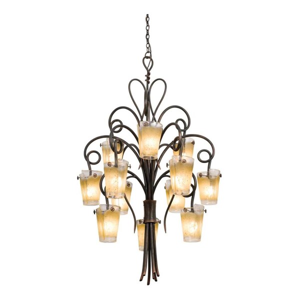 This Twelve Light Chandelier is part of the Tribecca Collection and has an Antique Copper Finish and Tribecca Frost Side Glass.