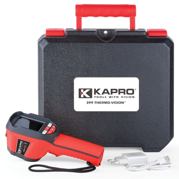 The Kapro 399 Themo-Vision Imager represents temperature distribution as a visible image in real time. It can detect temperatures between -4degrees F to 842degrees F -20degrees C to 450degrees C. This Thermal Imager easily switches between highest and lowest temperature cursors so that you can detect temperature differences of outlets, leaks, ceilings, drywall, and more.Visible image resolution reaches 0.3 MP and comes with up to 5 selectable color palette gradient options. The 399 features built-in rechargeable batteries and comes in a protective hard carry case.