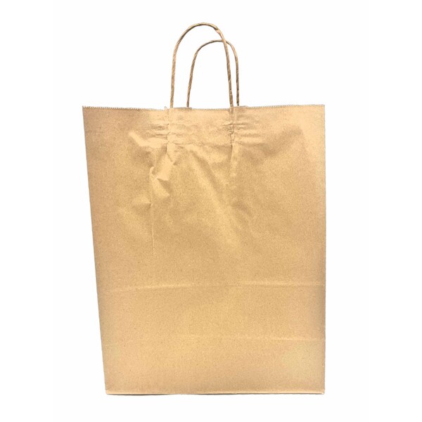 The Senior Kraft Twist Handle Bag measures 13 inches by 7 inches by 17 inches and features a twist handle design for secure closure and easy carrying. It is constructed from durable kraft material, suitable for holding various items. Available in a pack of 250, the bag is designed for convenience and strength, making it ideal for food service, retail, or general packaging use. Its dimensions provide ample space while maintaining a compact form for efficient storage and transport.