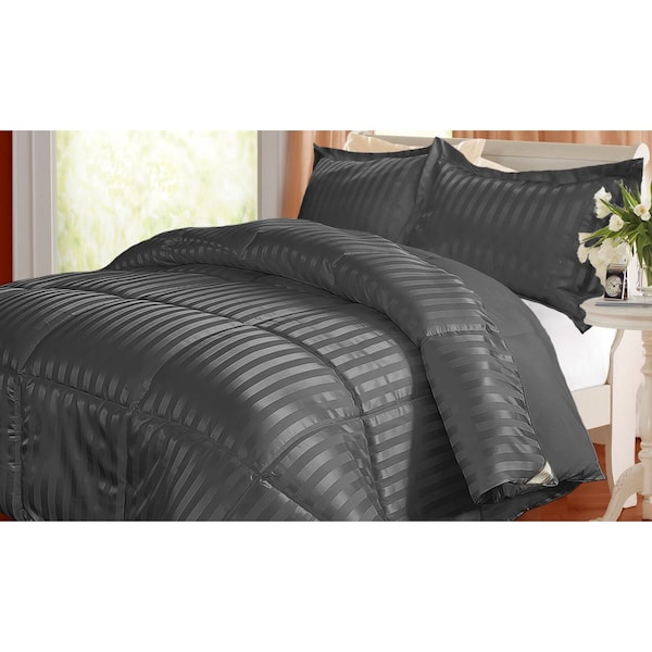 Down Alternative Solid/Stripe Reversible Comforter, Black, Twin