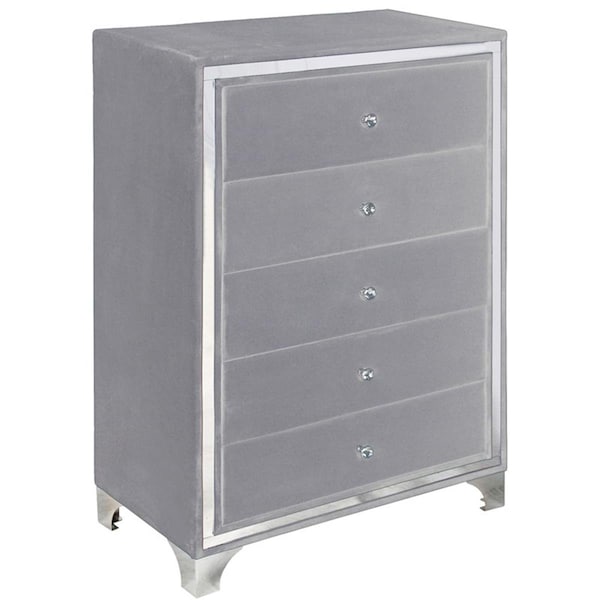 Monica Velvet Upholstered 5 Drawer Chest Dresser, Gray