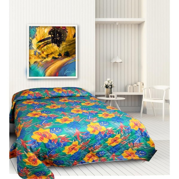 Quilted Tropical Print Bedspread, Blue, Orange & Yellow - Queen Size (Discontinued)