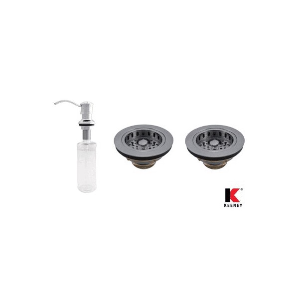 Upgrade your kitchen with Keeney's convenient kitchen remodeling kit with a decorative polished chrome finish. It includes (2) sink strainers and (1) soap/lotion dispenser. The strainers come complete with a deluxe adjustable post basket and are constructed of professional grade brass with safety-rolled edges. The soap dispenser holds up to 16 oz. of liquid and can be easily refilled above-the-counter so there's no need for you to reach below the sink. All nuts and washers are included for easy installation.