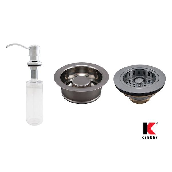 Upgrade your kitchen with Keeney's convenient kitchen remodeling kit with a decorative polished chrome finish. It includes (1) sink strainer, (1) garbage disposal stopper, and (1) soap/lotion dispenser. The strainer and garbage disposal stopper are constructed of professional grade brass with safety-rolled edges, and the strainer comes complete with a deluxe adjustable post basket. The soap dispenser holds up to 16 oz. of liquid and can be easily refilled above-the-counter so there's no need for you to reach below the sink. All nuts and washers are included for easy installation.