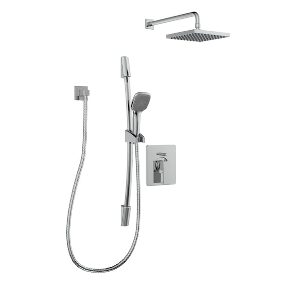 The Quadrato pressured balanced shower kit provides affordable luxury with a sleek, modern design and long-lasting durability. Featuring a stylish square rainfall showerhead and multi-function hand shower, the Quadrato Shower Kit is of Grade A brass construction and has a ceramic cartridge for maintenance-free use. Its TempRIGHT temperature limiting device prevents water from becoming too hot while soft, silicone nozzles allow you to easily wipe away build-up from hard water and lime scale. Both the showerhead and hand shower have 1.8 GPM flow rates. The kit includes a shower faucet with a pressure balanced diverter valve, showerhead, multi-function hand shower, ceiling shower arm and flange, sliding bar with a flexible hose, and water supply elbow. An optional wall mounted shower arm and all trim and valve components needed to install this shower faucet are included.