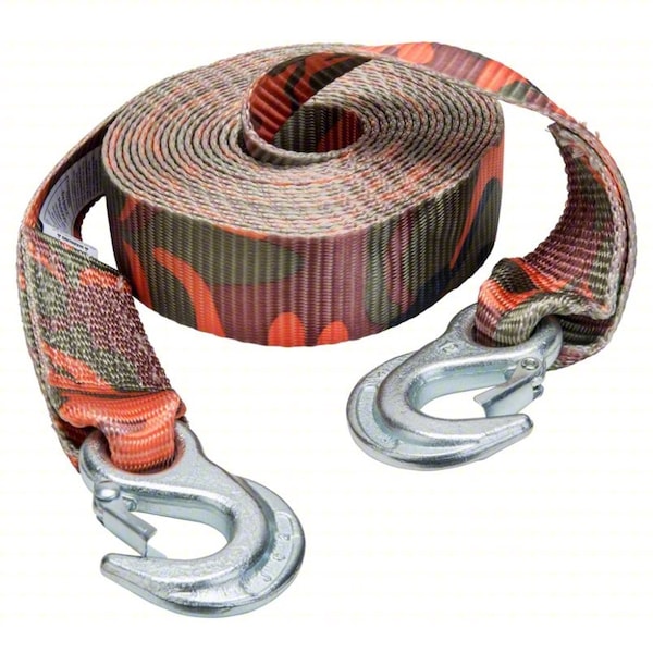 Emergency Tow Strap, Strap Style Tow Strap, Attachment Style Forged Steel Hoop w/latch, Duty Capacity Standard Duty, Number of Ply 1-Ply, Overall Length 20 ft, Overall Width 2 in, Color Blaze Camo, Number of Straps 1, Material Polyester, Grade Not Applicable, Working Load Break Strength 12,000 lb, Webbing Break Strength 12,000 lb, Assembly Break Strength 5,000 lb, Standards Not Applicable, Features Abrasion Resistant, Includes Not Applicable, Hook Type Slip Hook